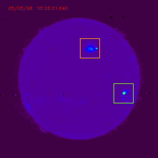 Active regions NOAA8210 and 8214 are seen as bright compact sources