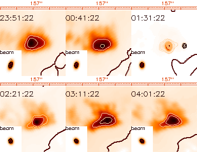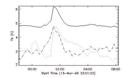 Time evolution of the maximum brightness temperature (Tb) in the box.