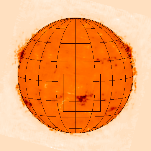 Image of the whole sun at 17 GHz (negative). A rectangle shows the